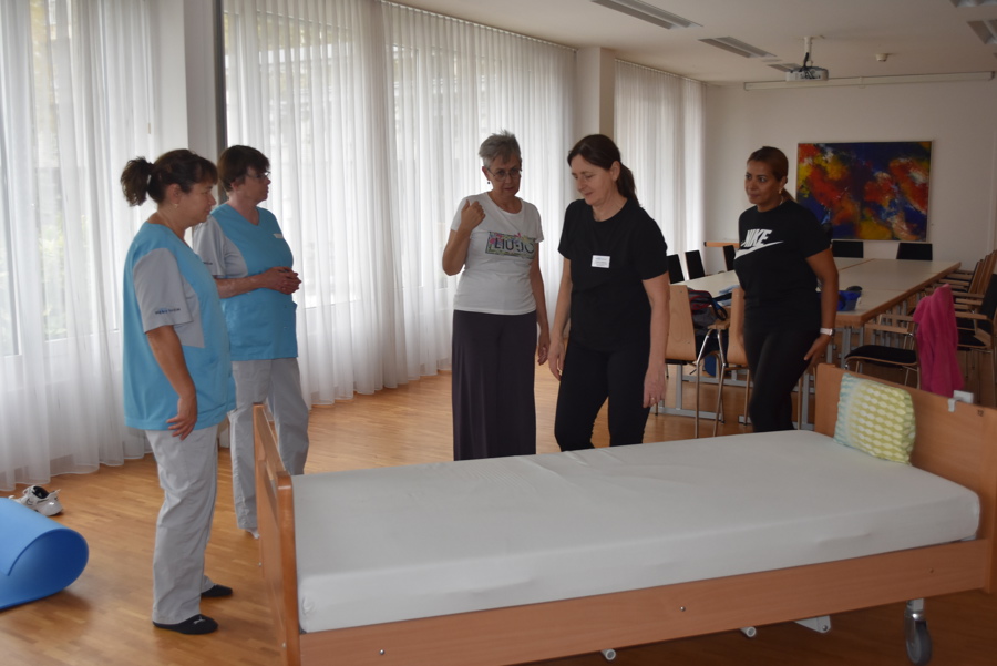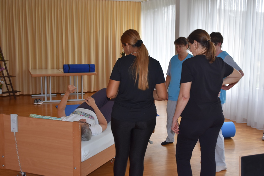 Kinästhetik bedeutet wörtlich „Bewegungswahrnehmung“ und ist die Lehre von der Wahrnehmung und Gestaltung eigener und fremder Bewegungen, um sie kraftsparender und einfacher zu gestalten. In der Pflege ist es ein Konzept, das darauf abzielt, Bewegungen von Pflegebedürftigen durch Berührung und Kommunikation zu unterstützen, anstatt sie passiv zu heben, um deren Mobilität und Motivation zu fördern und die Pflegekraft zu entlasten. Neben anderen Weiterbildungsthemen wird auch die Kinästhetik regelmässig intern durch unsere Pflegedienstleitung geschult. Als nächstes steht ein Deutschkurs für Mitarbeitende der Pflege an.