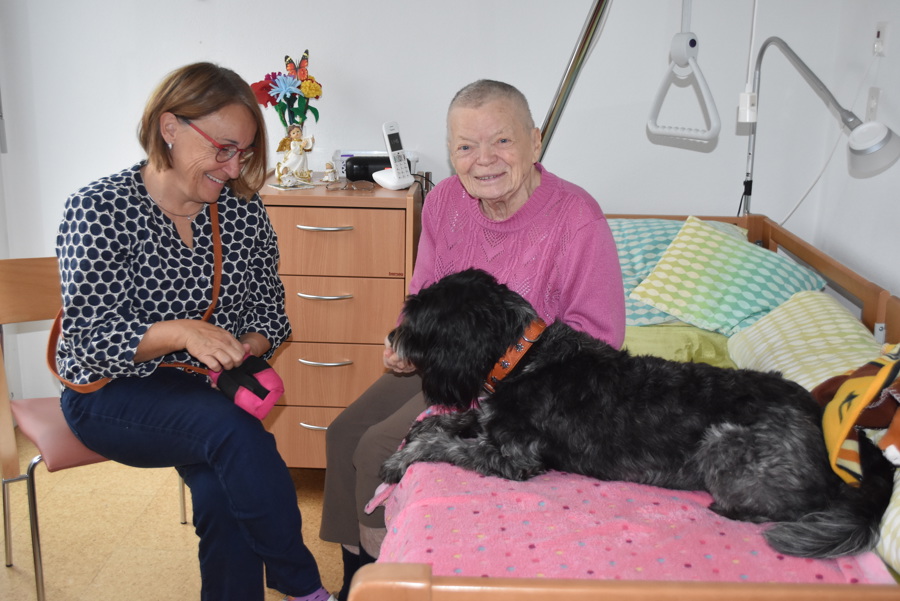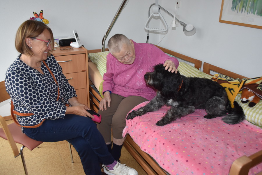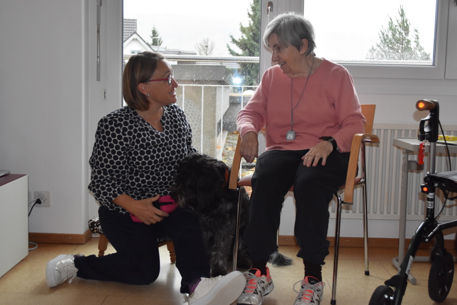 Susanne Loosli und ihre Sozialtherapie-Hündin Bella sind regelmässig Gäste im Alterszentrum Marienheim. Die beiden machen sich jeweils an einem halben Tag auf den Weg durch das ganze Haus und besuchen die Heimbewohnerinnen und Heimbewohner auf ihren Zimmern. Natürlich ist Bella auch bei den Mitarbeitenden immer wieder ein gern gesehener Gast.